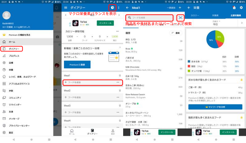 ここでは詳しい使い方は説明しませんが、メニューから「ダイアリー」を選択して商品名や食材名で検索をします。